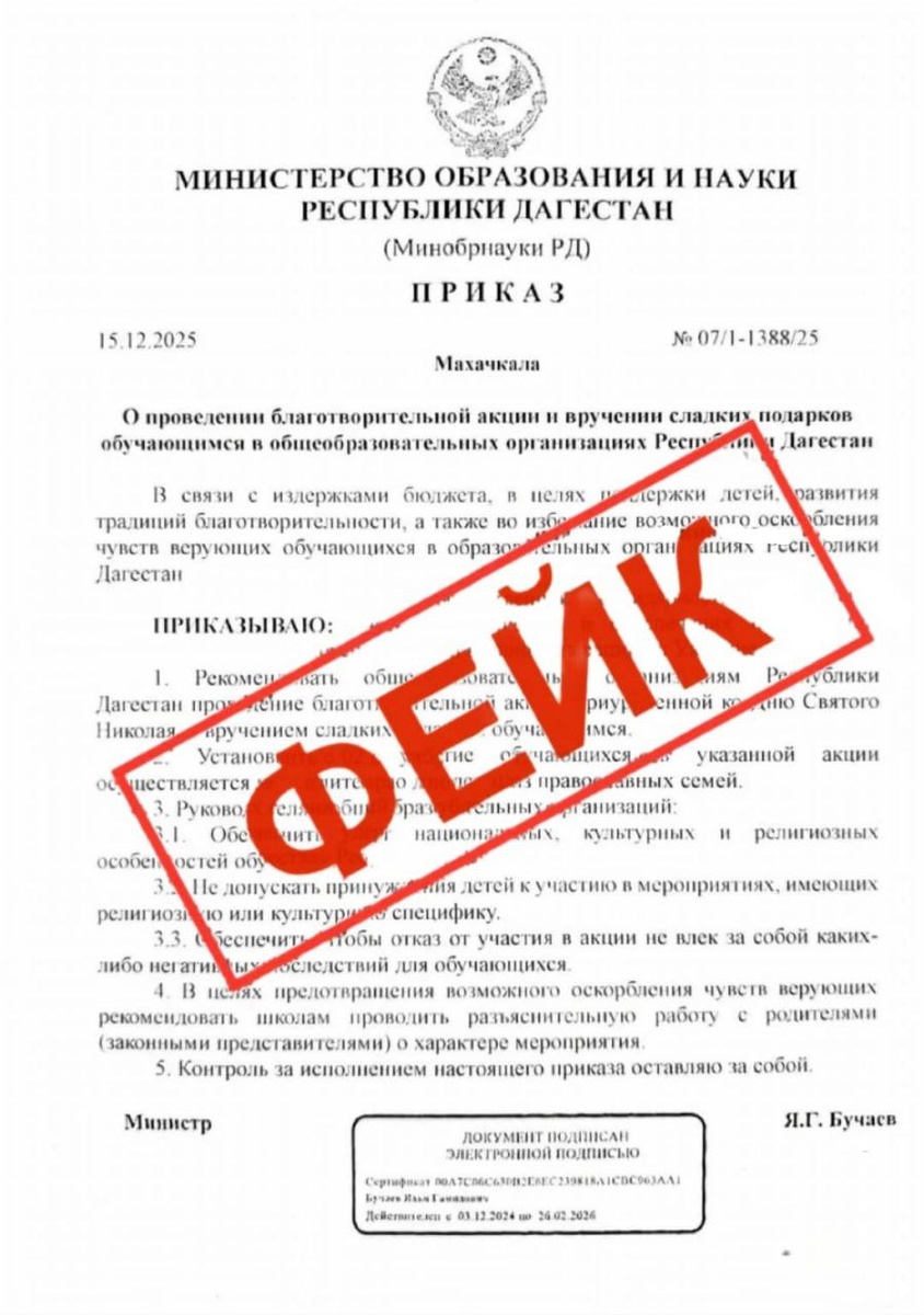 Указанные сведения не соответствуют действительности и являются ложными. Приказы, постановления либо иные нормативные правовые акты, предусматривающие проведение благотворительных акций, приуроченных ко дню Святого Николая, не издавались и не принимались Министерством образования и науки РД.