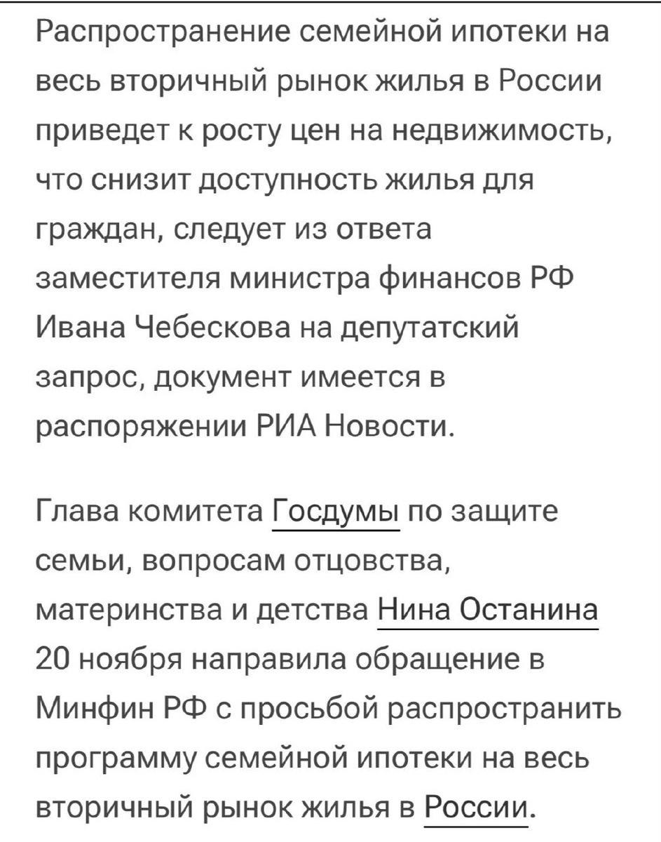 Ой, а что случилось? Теперь, когда президент сам озвучил уже лично, и Минфин, вдруг, прозрел. Это я получается на 5 лет раньше Минфина осознал, спорил с профессиональным сообществом, главный редактор уважаемого бизнес издания называл меня радикалом (по глазам читалось что считал сумасшедшим), а теперь уже на уровне федеральных министерств подтверждают мои слова не только на закрытых совещаниях, но и публично. Минфин здесь не первый на самом деле, еще пару лет назад осторожный скепсис к программе озвучивала Эльвира Сахипзадовна, но шепотом, чтобы никто не услышал. Но посмотрите как иезуитски Минфин пишет только про вторичку, и то потому, что вынужден отвечать на запрос. То есть Минфин признает негативное влияние семейной ипотеки, но говорит только в контексте вторички, а первичку игнорирует. Люди в московских гостиных говорят, что Минфин всегда был против. Но Минфин дежурно всегда против любых доп расходов бюджета, это такая официальная позиция, они как бы против, но не деятельно. Поэ