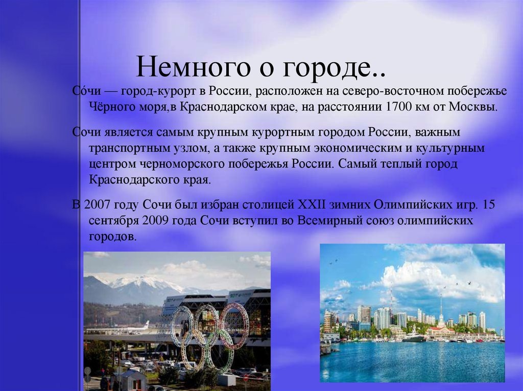 Сочи — субтропический курорт, расположенный на северо-восточном побережье Чёрного моря в Краснодарском крае. Территория Большого Сочи разделена на четыре внутригородских района: Адлерский, Хостинский, Центральный и Лазаревский. sochi.mid.ru С 1 января 2026 года Сочи становится курортом федерального значения. dzen.ru Климат Сочи находится в зоне субтропического климата. Здесь мягкая зима, тёплое лето и большое количество солнечных дней в году. Благодаря близости Чёрного моря и Кавказских гор климат отличается высокой влажностью, что особенно ощущается летом. travel.sotrans.ru Некоторые особенности погоды в разные месяцы года: Зима (декабрь, январь, февраль) — средняя температура воздуха колеблется от +5°C до +10°C, осадки выпадают часто, но снег — редкость. Весна (март, апрель, май) — в марте температура поднимается до +10°C…+15°C, а к маю достигает +20°C…+25°C. Лето (июнь, июль, август) — температура воздуха держится на уровне +25°C…+30°C, а вода прогревается до +23°C…+26°C. Осе