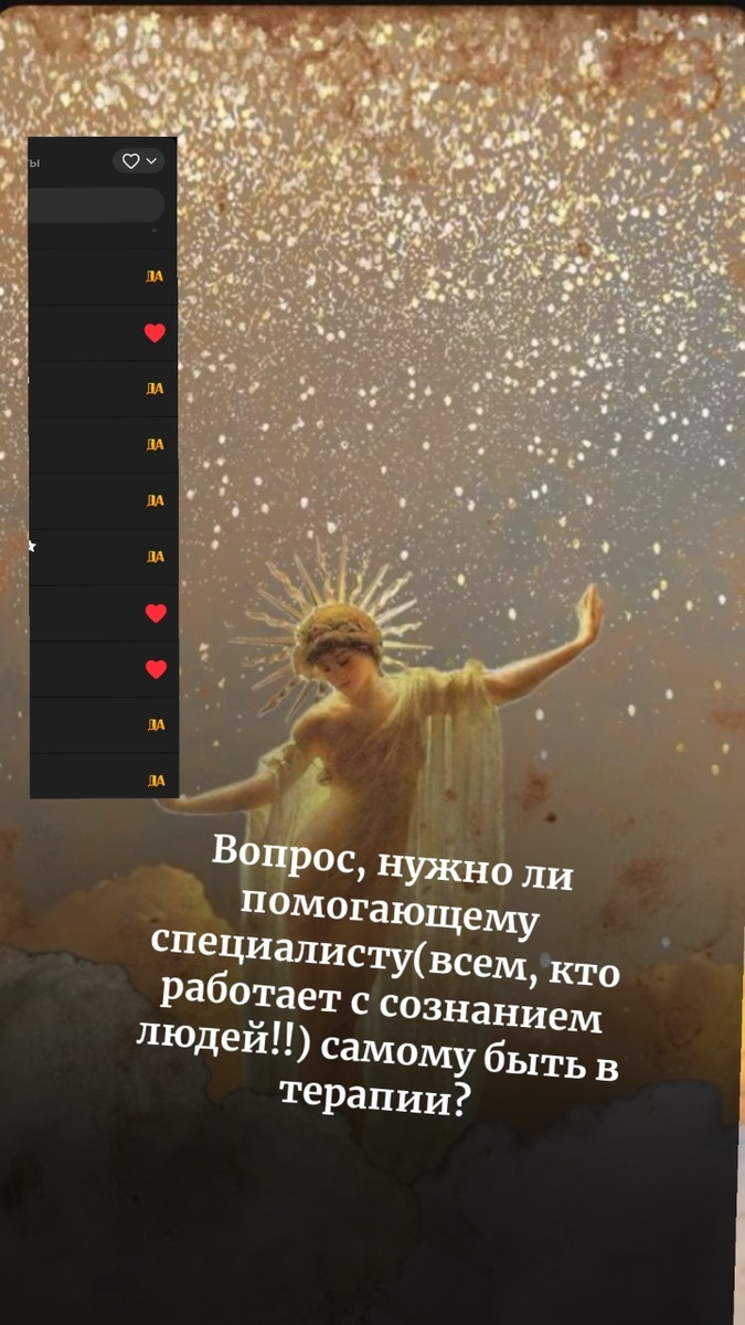 Людям важно, чтобы тот к кому они обращаются за помощью, сам умел эту помощь запрашивать и получать. Сделала опрос у себя в сториз (см фотку). Ради интереса. В скрин не поместились все ответы "ДА". Как-то мне дали обратную связь, что "не говори, что ты в терапии с 2015. А то подумают больная". Я тогда очень удивилась. Это же естественно подумала я. Считаю Терапию НЕОБХОДИМЫМ УСЛОВИЕМ, если хочешь оказывать профессиональную помощь людям, а не навязывать свое мнение и играть с масками учителей, гуру и мастеров, отыгрывая свои же сценарии. И я имею ввиду здесь полноценный выстроенный контакт клиент-терапевт опыт долгосрочной терапии и выстраивания отношений. ⚠️Разовые консультации от специалиста к специалисту - это не то. Хорошее дополнение, но всеравно не то. ⚠️Марафоны, курсы - класс, но все же этого мало.Могут быть перерывы, смена специалистов. Наш процесс самопознания не заканчивается, он раскручивается как спираль, расширяясь и ставя перед нами новые задачи. И многие специалис