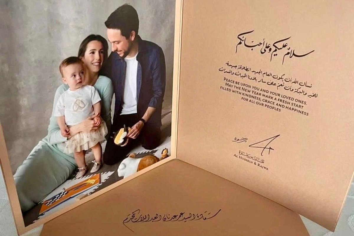 Открытка, на которой Иордания улыбается Кронпринц Иордании Аль‑Хусейн, кронпринцесса Раджва и их дочь, принцесса Иман, поделились праздничной открыткой: домашний кадр и короткое пожелание нового года. Для