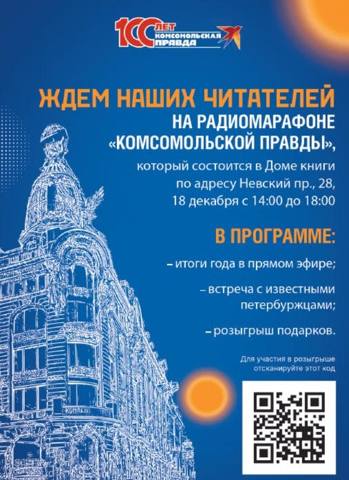 Дорогие слушатели (и читатели)! Приходите к нам на радиомарафон в Дом книги! Он будет уже в этот четверг, 18 декабря, с 14.00 до 18.00. И мы приготовили для вас много классного. Например, встречу с известными петербуржцами. Вас ждут: ✔️ биолог Павел Глазков; ✔️ актер Анвар Либабов; ✔️ кинокритик Михаил Трофименков; ✔️ писатель Андрей Кивинов; ✔️ музыкант Билли Новик; ✔️ И другие интересные собеседники. А еще, конечно, розыгрыш потрясающих подарков от «Комсомолки». Возьмем с собой 50 призов (мультиварку, пылесос, портативный аккумулятор, наушники, другую технику и множество книг) и с помощью лототрона раздадим их подписавшимся на наши каналы в телеграме и max. Скучаем! Ждем! Читай нас в MAX! | Подпишись на Комсомольскую правду: СПб