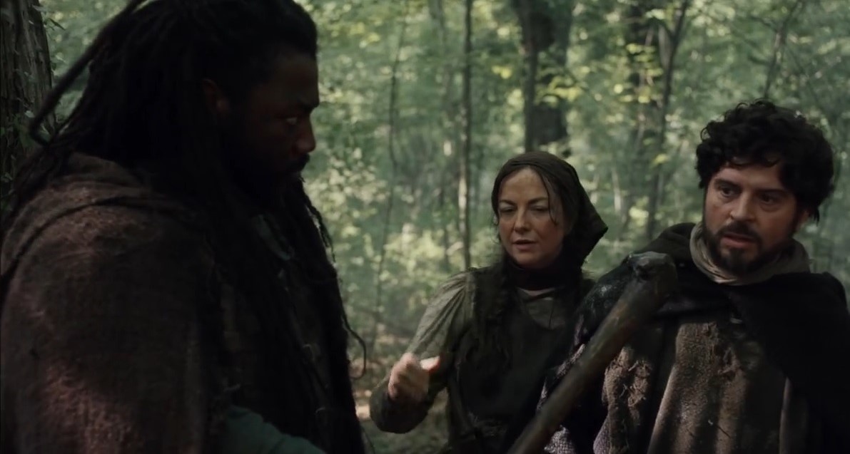 Да, и самое главное в этой серии. Главный герой наконец получает своё имя - испуганный епископ говорит шерифу - в лесу на меня напал жуткий дьявол под именем Робин Гуд. Уф, теперь так и буду его звать, а то всё Роб или Роберт. Что же касается «Гуд», так это чернявый вор представил своего лидера епископу, как «Роб в Плаще». Вот и получилось - «Rob in hood», режиссер предлагает именно эту версию происхождения имени героя.