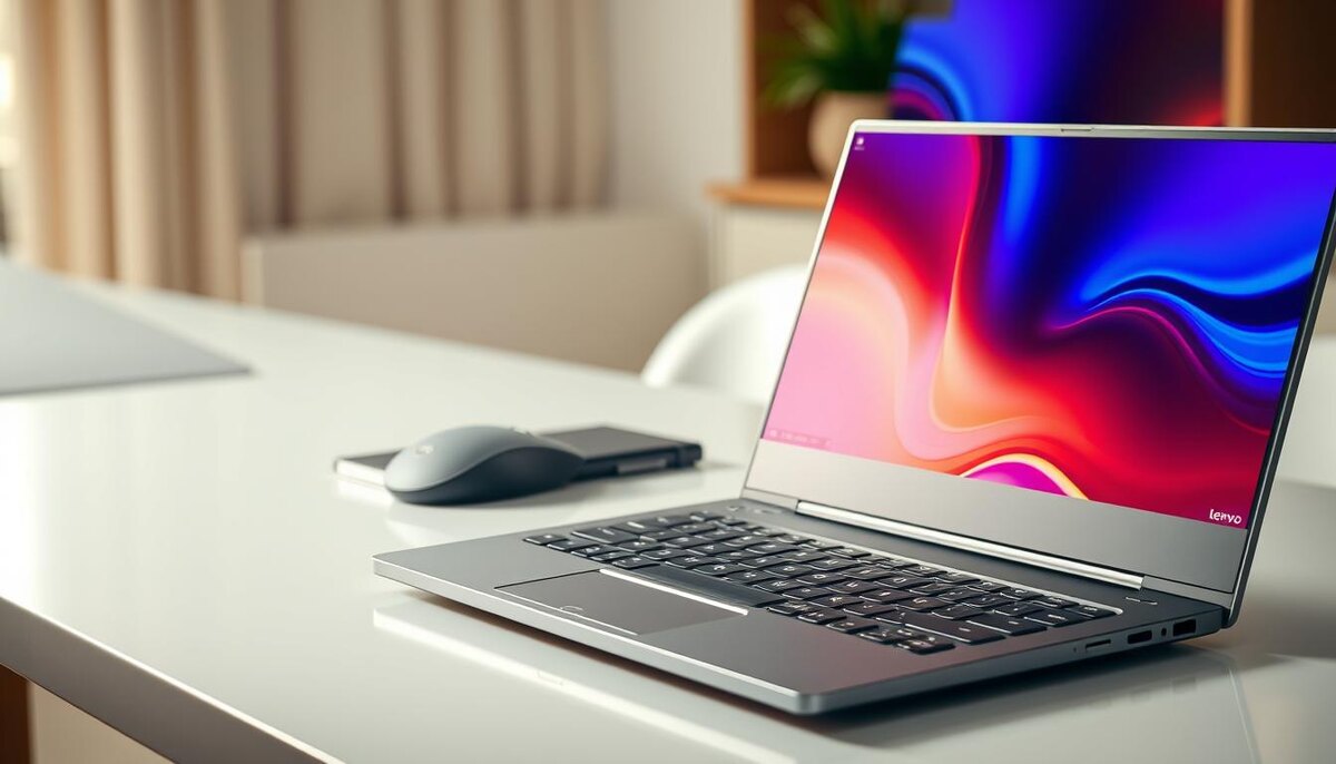 A close-up view of the Lenovo IdeaPad Slim 3 15.6" IPS FHD display, showcasing vibrant colors and sharp details. The screen is turned on, displaying a stunning nature scene with rich greens and blues, emphasizing the display's high-resolution capabilities. The laptop is positioned on a sleek wooden desk, with a soft focus on the background featuring a modern, minimalistic office space. Soft, diffused natural light filters in from a nearby window, creating a warm and inviting atmosphere. The angle captures the laptop from slightly above, highlighting the sleek profile and thin bezels of the device. The overall mood is professional and sophisticated, ideal for an article focusing on technology and design. No text or branding visible in the image.