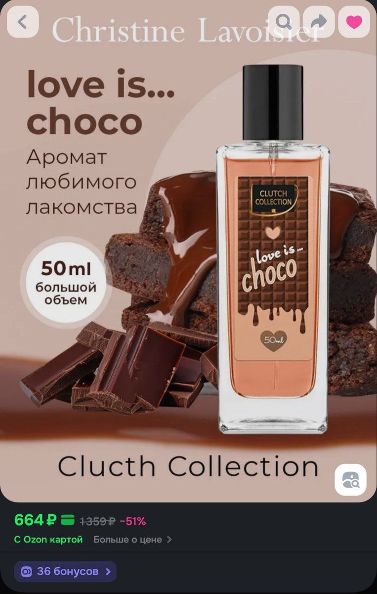 Духи женские сладкие Clutch Collection Love is Choco шоколад, ваниль, карамель. Духи стойкие, парфюм женский, пробник духов ➕ 200 бонусов в карточке товара около названия магазина (ими можно оплатить 25% от суммы) https://ozon.ru/t/nKpsD98