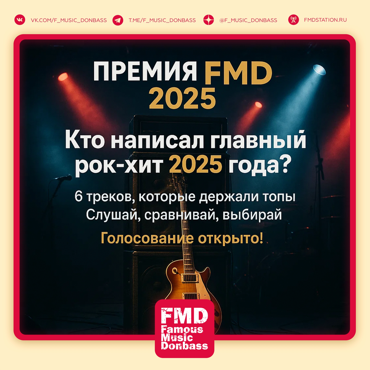 Подводим черту под 2025-м. В номинацию «Рок-песня года» попали только абсолютные чемпионы. Здесь нет проходных треков — только те, кто набрал максимальные баллы и заставил экспертов единогласно поднять таблички с «десятками». Топ тяжелого цеха и альтернативы в одном плейлисте. Где и как пройдёт премия: Церемония награждения пройдёт в формате радиошоу на волнах «Станции FMD» — там мы назовем победителей. Отмечать победы будем громко и все вместе 17 января в клубе Underground Stage на большом концерте топовых исполнителей года. Четыре артиста каждой сцены, отличный звук и правильная компания. Билеты и подробный лайн-ап анонсируем в ближайшие дни. Голосование за «Рок-песню года»