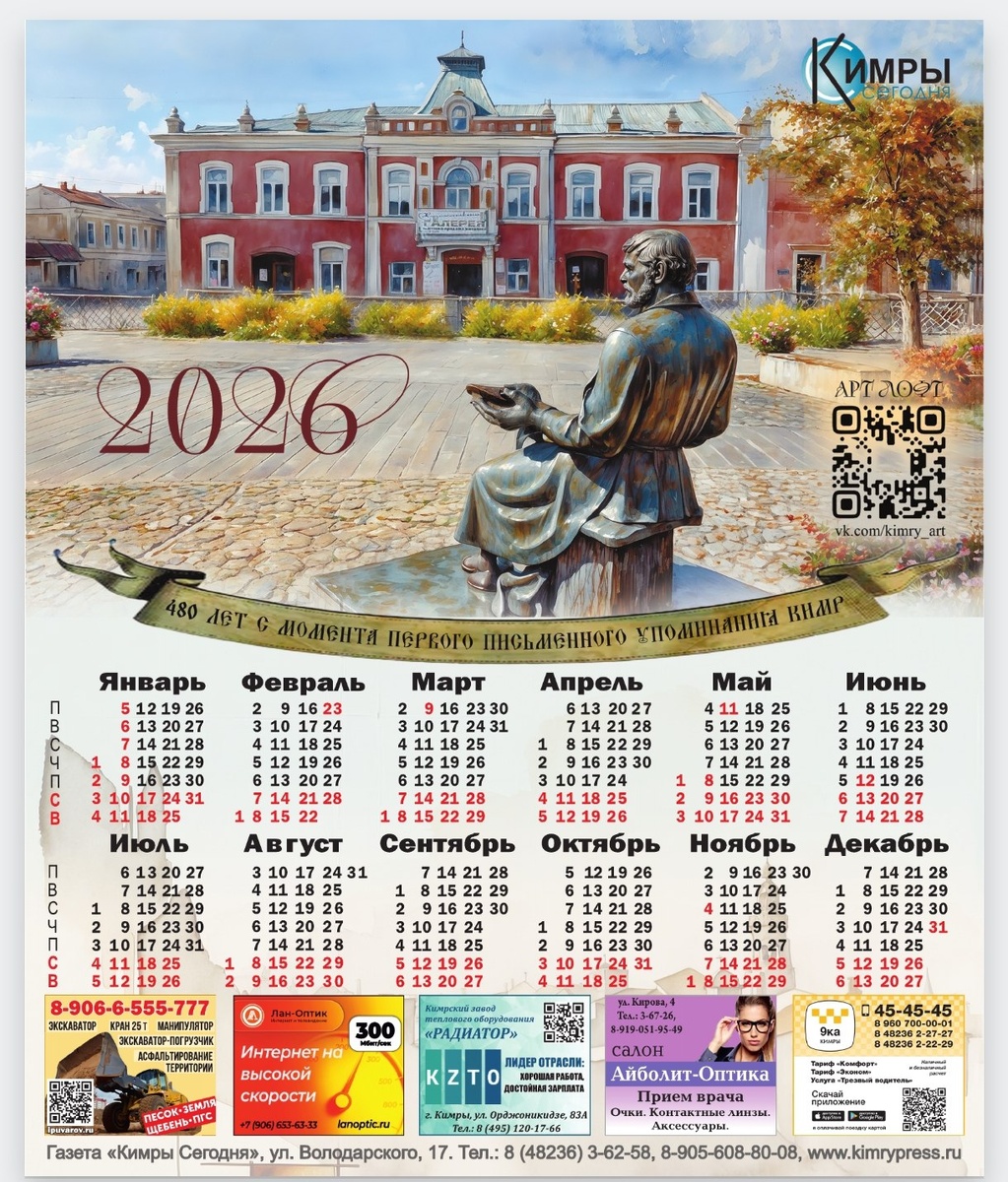 Прекрасный новогодний подарок — календарь на 2026 год от «Кимры сегодня» Редакция подготовила для подписчиков и покупателей нашей газеты новогодний подарок – красочный ка календарь. Традиционно его получат все те читатели, которые были с любимой газетой в 2025 году. Как и прежде, мы выбрали для иллюстрации знаменитую архитектуру нашего исторического города. В этот раз — работу фотохудожника Вячеслава Башина. А главным событием в наступающем новом году — 480-летие первого письменного упоминания Кимр. Календарь от «Кимры сегодня» с удовольствием покупают туристы, приезжающие в наш город. Это прекрасный подарок для ваших знакомых и близких. Сетку календаря по просьбам пожилых людей редакция разработала так, что ее легко прочесть даже с большого расстояния. Читателям нравится. Купить календарь можно в редакции газеты «Кимры сегодня» по адресу ул. Володарского, 17. Цена — 50 рублей. Тел.: 8 (48236) 3-62-58, 8-905-608-80-08.