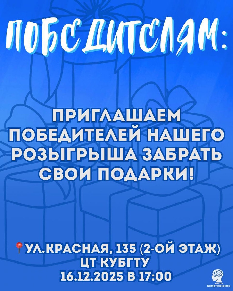 💙Совсем недавно прошёл наш конкурс, а уже завтра мы готовы вручить призы победителям: 1. зоя🌱 (@loxyshhka0) 2. RTR (@Retro63) 3. legoVic (@IegoVic) Ждём вас завтра в 17:00 в ЦТ🗿 За подробной информацией обращайтесь: @andreykeglya Следите за нами: 📱 Телеграм 📱 ВК #ЦентрТворчестваКубГТУ #КубГТУм #КубГТУ #КубанскийПолитех