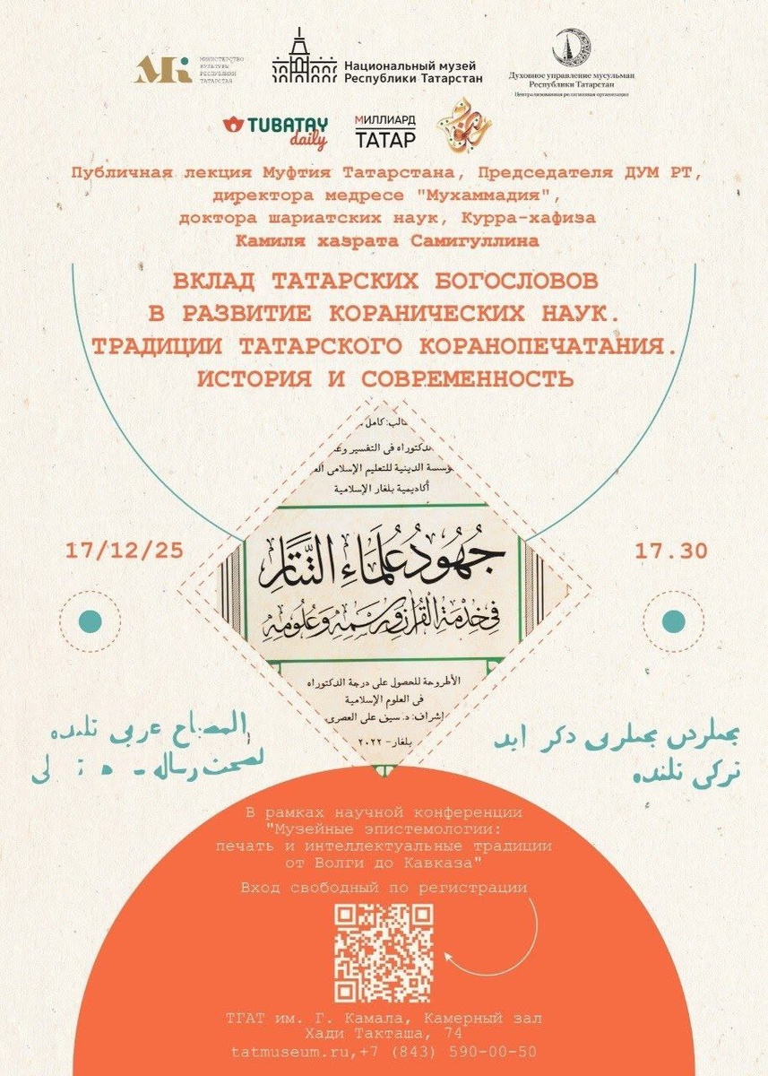 ☪Муфтий прочитает публичную лекцию об истории и современности татарского коранопечатания. ✅17 декабря в 17.30 в камерном зале ТГАТ им. Г. Камала (ул. Хади Такташа, 74) состоится публичная лекция Муфтия Татарстана, Председателя ДУМ РТ, директора медресе «Мухаммадия», доктора шариатских наук, Курра-хафиза Камиля хазрата Самигуллина. ☝️Муфтий выступит на тему «Вклад татарских богословов в развитие коранических наук. Традиции татарского коранопечатания. История и современность». Организатор лекции – Национальный музей Республики Татарстан при поддержке Министерства культуры Республики Татарстан. Мероприятие проводится в рамках научной конференции «Музейные эпистемологии: печать и интеллектуальные традиции от Волги до Кавказа» в честь 125-летия типографии братьев Каримовых. Вход свободный по регистрации Если вам удобно читать новости в МАХ, то наш канал уже ждет вас: подписывайтесь: max.ru/dumrt