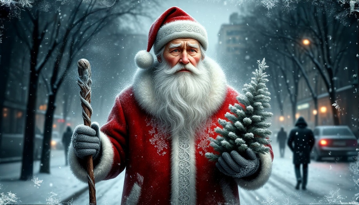 И тут он увидел его! Деда Мороза в бутафорском костюме! Тот стоял перед торговым центром, воинственно подняв искусственную елочку над головой. Все как положено: белая борода, красный тулуп, посох.