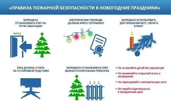 Правила пожарной безопасности на новогодних праздниках: Проверить исправность электропроводок и пожарной сигнализации перед праздником. Приобретать только сертифицированные гирлянды, бенгальские огни и пиротехнику. Не использовать пиротехнику и бенгальские огни внутри квартиры, в том числе с балкона или окна. Не оставлять включенные гирлянды и другие электроприборы без присмотра. Не перегружать розетки. Не курить в помещении и всегда до конца тушить сигареты и спички. Установить ёлку на устойчивую подставку вдали от отопительных приборов и эвакуационных выходов из помещения. Не оставлять без присмотра детей в новогодние праздники. Убрать подальше от маленьких гостей колюще-режущие и огнеопасные предметы, лекарства, средства бытовой химии. В случае возникновения пожара позвонить в службу спасения по телефонам «101» или «112». Источник https://uchaly102.ru/?p=116325