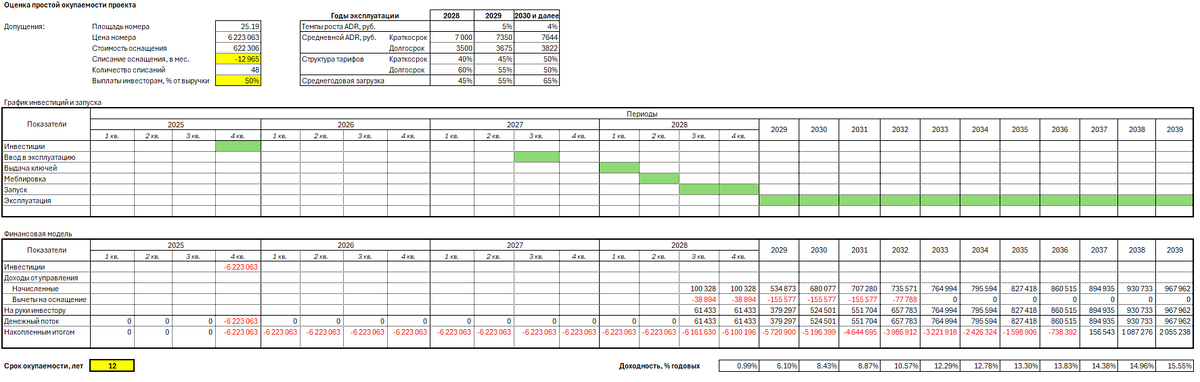 - Выплаты инвесторам заложены средний в размере 50% от выручки. Допускаю, что могут быть вариации, но это допущение для данного примера, поскольку отель еще не запущен. Если у Вас есть другие данные для данного проекта, пожалуйста, поделитесь.
