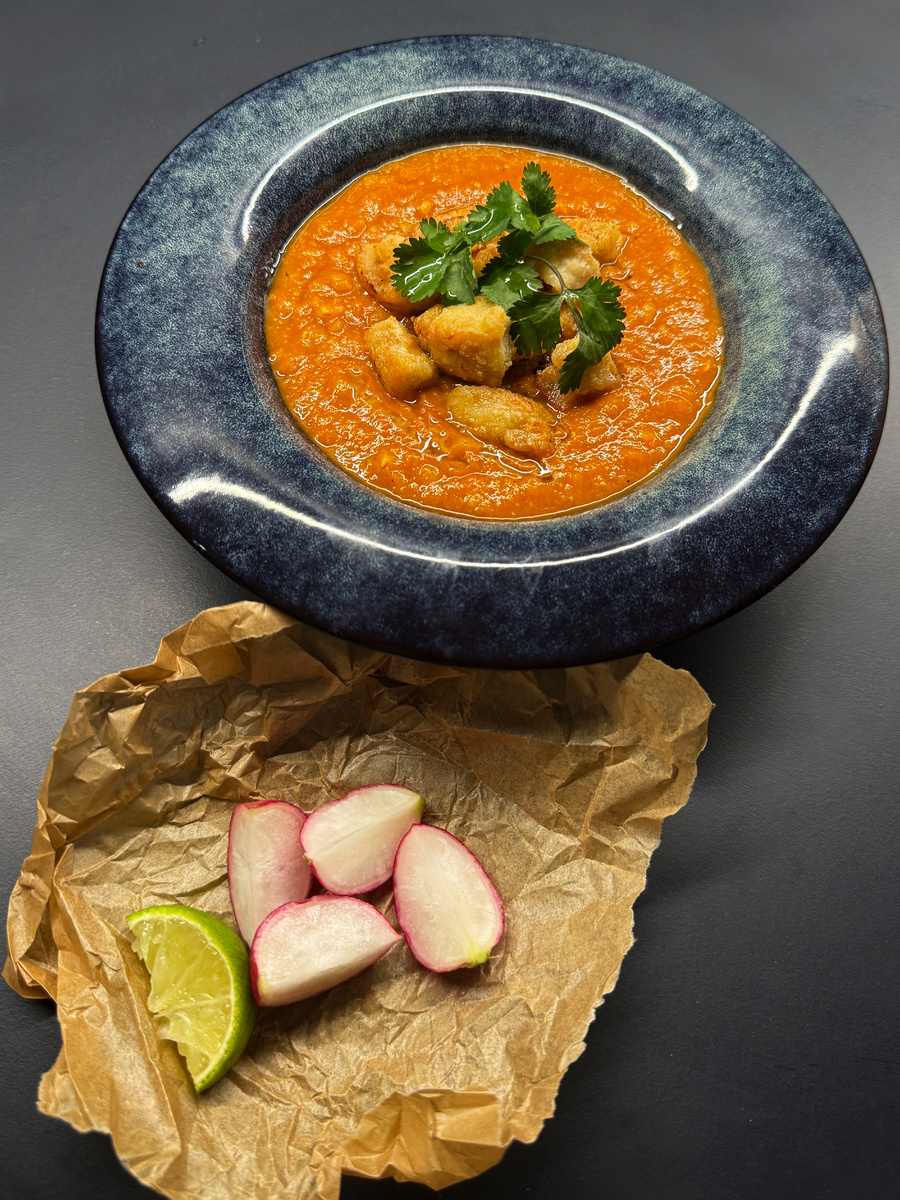 - Блендерим в шелковистый крем, доливаем воду, кладём оставшуюся чечевицу.