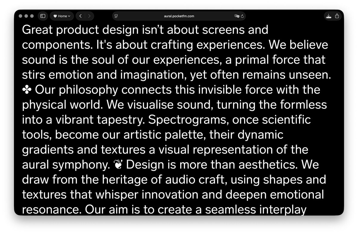 Это aural.pocketfm.com Лендинг от дизайн-команды PocketFM. С великолепной миссией Our philosophy connects this invisible force with the physical world Интересная находка на ленднинге: показать дизайн продукта до и после