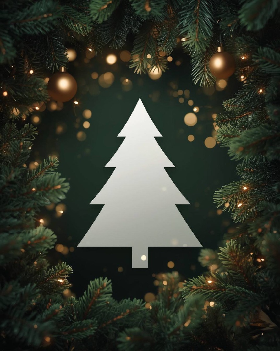 Премиальный фон для рождественского поздравления, элегантная и минималистичная композиция. Промт - Premium Christmas greeting background, elegant and minimal composition. A soft matte white Christmas tree silhouette centered in the frame, clean geometric shape with smooth edges, no text on the tree. Surrounding the tree is a dense frame of realistic deep green pine branches with fine needle detail, softly layered for depth. Subtle warm golden bokeh lights scattered naturally within the foliage, creating a festive glow. Floating metallic gold star ornaments placed asymmetrically around the tree, slightly out of focus for depth, realistic reflections and soft highlights. Dark green background tones with cinematic lighting, gentle vignette, shallow depth of field. Luxury holiday mood, calm and refined, modern festive design, ultra-realistic, high detail, premium aesthetic, studio-quality lighting, no people, no text, no logos, no watermarks.