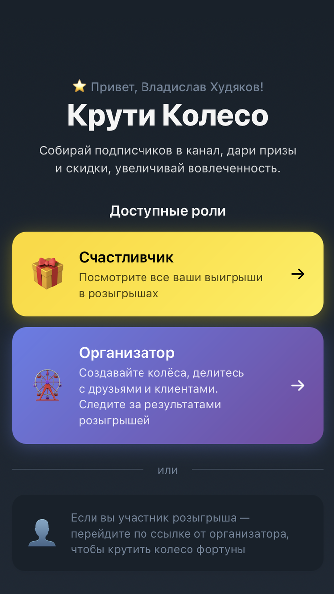 Клиент крутит колесо, выигрывает приз и хочет им воспользоваться. Это работает для любого B2C-бизнеса — от турагентств до бьюти-салонов. Всё работает в Telegram. Не нужны сайты, приложения или сложные настройки. Telegram-бот: @spot_spin_bot — позволяет создать колесо за 1-2 минуты, получить ссылку и начать собирать первых подписчиков и клиентов. Итак, как создать колесо фортуны Шаг 1: Откройте бота и создайте розыгрыш Откройте @spot_spin_bot в Telegram и нажмите "Создать розыгрыш", затем "Создать колесо". Регистрация не нужна — система автоматически определит ваш Telegram-аккаун