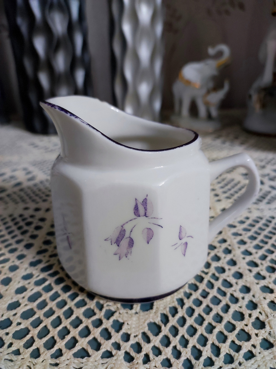 Приветствую всех заглянувших ко мне на огонёк! Прогноз не соврал, у нас сегодня уже дождь, снова зима закончилась, а так хочется настоящей зимней погоды и солнца, а не вечной слякоти и серости. Но с природой не поспоришь, поэтому следуем девизу - у природы нет плохой погоды и радуем себя приятными мелочами. А для поднятия настроения у меня много чего есть, например целая посылка нового фарфора. Чайничек и сахарницу я показывала в прошлой статье, сегодня на сцену (вернее на комод), выйдут сливочники. И первый очень интересной формы и очень нежный. Вот такой гранёный красавчик пополнил мою коллекцию с помощью подписчицы, спасибо ей огромное🥰 Возраста он почтенного и если не считать маленького скольчики, он в отличном состоянии. Определила временно на полочку. Второй сливочник тоже не частой формы, видела только парочку на Авито. Ветка Азалии или Багульник, ещё встречала название Цветущая ветка. Как правильно, к сожалению не знаю. Форма необычная и витая ручка. Состояние отличное,