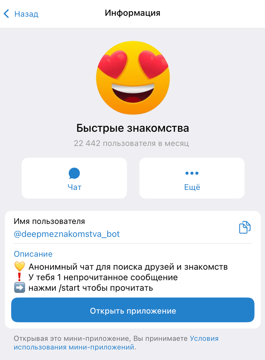 Что такое DeepMe - это телеграм-бот для знакомств, работает через @deepmeznakomstva_bot. У них есть сайт deepme.love, но всё основное происходит в мессенджере. Ты заходишь в бота, заполняешь базовую информацию и сразу можешь начинать. Качать отдельное приложение не нужно, регистрация минимальная. Для тех, кто живёт в Телеграме, звучит удобно.