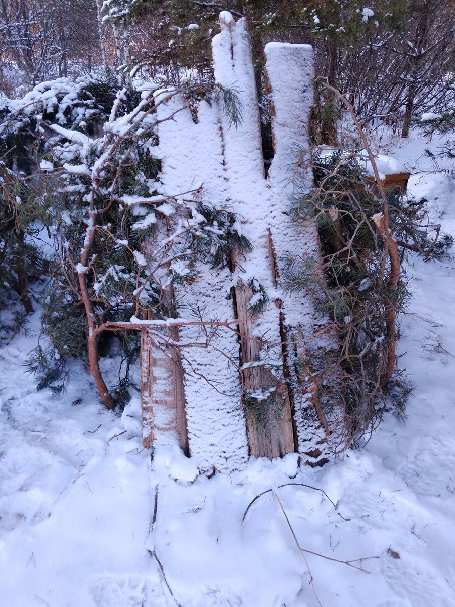 С приходом зимы❄❄ помогаю пчёлкам 🐝🐝 прожить морозы и температурные качели более ровно и с меньшими затратами энергии. Из веток и досок (можно просто из веток) вокруг улья формируется каркас. Лучше для этих целей подойдут лапы ели 🌲. Но поблизости они не растут. А у нас вдоль участка с южной стороны полоса из сосен, дающих много тени. Постепенно чищу нижний ярус ветвей и использую их для создания каркаса с приходом зимы. Затем произвожу обваловку снегом. Или природа сама помогает - снег постепенно сам застревает в ветвях, образуя подобие юрты. Наша задача наблюдать, чтобы случайно не засыпало леток, сохранить приток воздуха и корректировать по ходу дела обваловку снегом❄❄. Прошлый год показал прекрасный результат по зимовке таким способом. Несмотря на сильные температурные качели и высокую влажность воздуха все семьи вышли из зимовки без большого количества подмора и без плесени в ульях. Пока, конечно, это просто доски и ветви вокруг ульев. Но со временем они превратятся в аналог ю