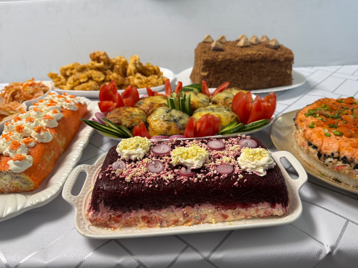 Салат «Мимоза» в рулете! Хотите удивить гостей необычной подачей любимого салата? Тогда этот рецепт для вас! Ингредиенты: Морковь — 3 шт. Картофель — 2 шт. Консервы сайра — 1 банка. Лук — 1 шт. Яйца — 3 шт. Сырок «Дружба» — 1 шт. Майонез. Соль, перец. Приготовление: Отварите морковь, картофель и яйца. Натрите морковь на мелкой терке и отожмите, если она слишком влажная. Застелите пленку на стол и определите размер рулета. Учтите, что рулет должен быть не слишком большим, длинным и с толстыми слоями. чтобы он не развалился при скручивании и не выдавил все слои. Первый слой: Натрите 3 моркови на мелкой терке, разравняйте его по пленке в квадрат, смажьте майонезом. Второй слой: Натрите 2 картофелины на крупной терке, посолите и майонезом. Третий слой: Разомните консервы сайры вилкой, добавьте мелко нарезанный лук и перемешайте. + майонез. Четвертый слой: Натрите 1 яйцо + 1 и сырок «Дружба» на крупной терке, добавьте соль и перец. + майонез. Каждый слой делайте короче от края, на котор