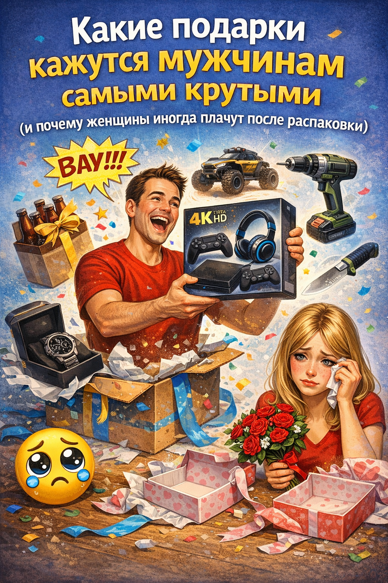 Есть особая категория подарков. Они искренне кажутся мужчинам гениальными. Продуманными. Практичными. Почти шедеврами. Проблема только в одном: женщины не всегда об этом догадываются. 1. Всё, что можно «починить», «заменить» или «улучшить» С точки зрения мужчины — это вершина заботы. — «Я же решил проблему!» Сковородка. Пылесос. Запчасть от машины. Крышка багажника (да, это отдельный жанр, рассказывала об этом ЗДЕСЬ). Для мужчины это логика. Для женщины — квест «почему у меня ощущение, что меня повысили до главного по быту». 2. Дорогое = автоматически круто Если подарок стоил как крыло самолёта — значит, он удался. Эмоции, стиль, контекст — вторичны. — «Ты видела цену?» Да. Видела. А теперь покажи смысл. 3. То, что нравится ему Нижнее бельё, выбранное «по зову сердца». Парфюм «мне очень зашёл». Одежда «я бы носил, если бы был тобой». Сюрприз! Это подарок не женщине. Это подарок себе через неё. 4. Всё, что обещает эффективность Мужчины обожают вещи, которые: экономят время ускоряют