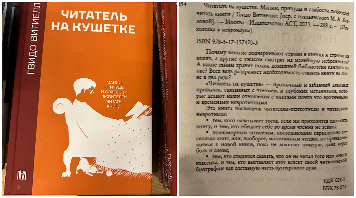 Никто не может прочитать все книги, которые того стоят. Эту книгу итальянского автора Гвидо Витиелло издательства АСТ углядела на книжной ярмарке в ГЭС-2 в ноябре 2025 г. Зацепилась глазом за яркую оранжевую обложку (мой любимый цвет), название тоже достаточно цепляющее, да еще и подзаголовок - "мании, причуды и слабости любителей читать книги". Аннотация тоже не подкачала (см фото справа). Покупать не стала, но "запомнила" в смартфон, а месяц спустя обнаружила на абонементе в одной из московских библиотек (а точнее в библиотеке-читальне им. А. С. Пушкина, рядом с Елоховским собором - если кто-то из москвичей заинтересуется). Как считаете, бы вам интересно почитать или хотя бы полистать книгу Я была бы не я, если бы не предупредила вас о недостатках этого опуса. "Читатель на кушетке" - юмористическое исследование читательской психологии, местами довольно сумбурное и пестрящее невероятным количеством цитат и отсылок к авторитетам из разных областей - психологии, истории, литературы, п