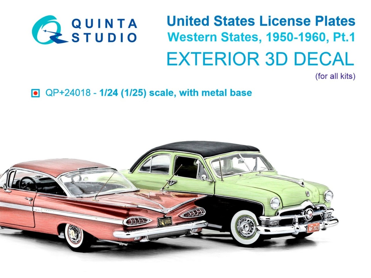 Quinta modelling studio выпустили автомобильные номера США в 1/24 масштабе: Артикул: QP+24018 1/24 Автомобильные номера США, западные штаты, 1950-1960 (для всех моделей) (на метал. основании) цена: 880 ₽ Артикул: QP+24016 1/24 Автомобильные номера США, юго-западные штаты, 1950-1960 (для всех моделей) (на метал. основании) цена: 720 ₽ Артикул: QP+24013 1/24 Автомобильные номера США, северо-восточные штаты, 1910-1940 (для всех моделей) (на метал. основании) цена: 560 ₽