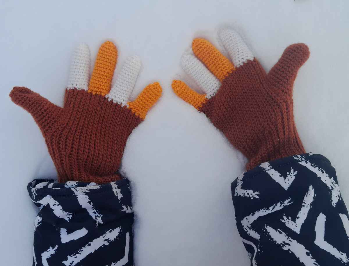 Я всех рада приветствовать на своем канале. Спасибо, что нашли время и заглянули. Вы на канале "Вяжу опять и снова. Вязаномания" Мой комплект: шапка, шарф и перчатки готов. Сегодня знакомимся с описанием вязания перчаток. Комплект я связала из Пехорки "Детский каприз", состав пряжи: 50 % мериносовая шерсть, 50 % фибра. Вес мотка 50 г, длина нити 225 м. Вязала крючком 3 мм. Описание шапки смотрите ниже. А это описание вязания шарфа. Перчатки крючком (спицами никогда не вязала, но стоит попробовать) я вяжу не первый раз. Мне такие перчатки нравятся, так как они получаются очень тёплыми. Перчатки решено было связать трехцветными. Самая маркая часть (ладонная) связана кирпичным цветом, а цвет пальцев чередуется. По этому описанию можно связать перчатки на любой размер. Первым делом вяжется ладонь вместе с манжетой. Чтобы придать анатомическую форму перчатке, нужно основную часть периодически вязать укороченными рядами, где манжета, там рядов будет меньше. Для начала нужно связать воздуш