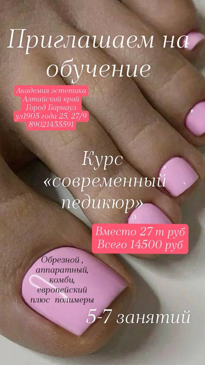 В курс « современный педикюр» входит абсолютно все, что нужно! Ты сможешь, делать комби педикюр, клиентам у которых проблемные стопы, с элементами подологии. Виды фрез, техника работы песочным колпачком и диском(смарт) , обрезная техника, особенности применения при различных обстоятельствах. Покрытие , выравнивание , протезирование ногтя. Разберем обычные ошибки начинающих мастеров. Получишь методичку со схемами и описанием техник. Курс идет 10 -15 занятий , индивидуальный график, По окончанию диплом. Практика 80%. Стоимость 14500 руб Барнаул, ул 1905 года 25 Звони 89021435591