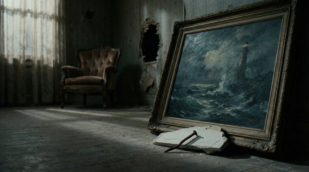 Комната дедушки после его ухода превратилась в некий музей памяти. Мы ничего там не меняли: те же тяжелые шторы, запах старых книг и его любимое кресло. Но главной героиней этого пространства всегда была картина — старый, написанный маслом пейзаж с изображением бушующего моря и одинокого маяка. Дед обожал её, мог часами смотреть на волны, говоря, что в этом шторме он находит покой. Но как только его не стало, картина начала «протестовать». Первый раз она упала через неделю после похорон. Мы списали это на старую бечевку, которая просто перетерлась от времени. — Мам, ну смотри, узел развязался, — сказала я, поднимая тяжелую раму. — Никакой мистики, просто физика.