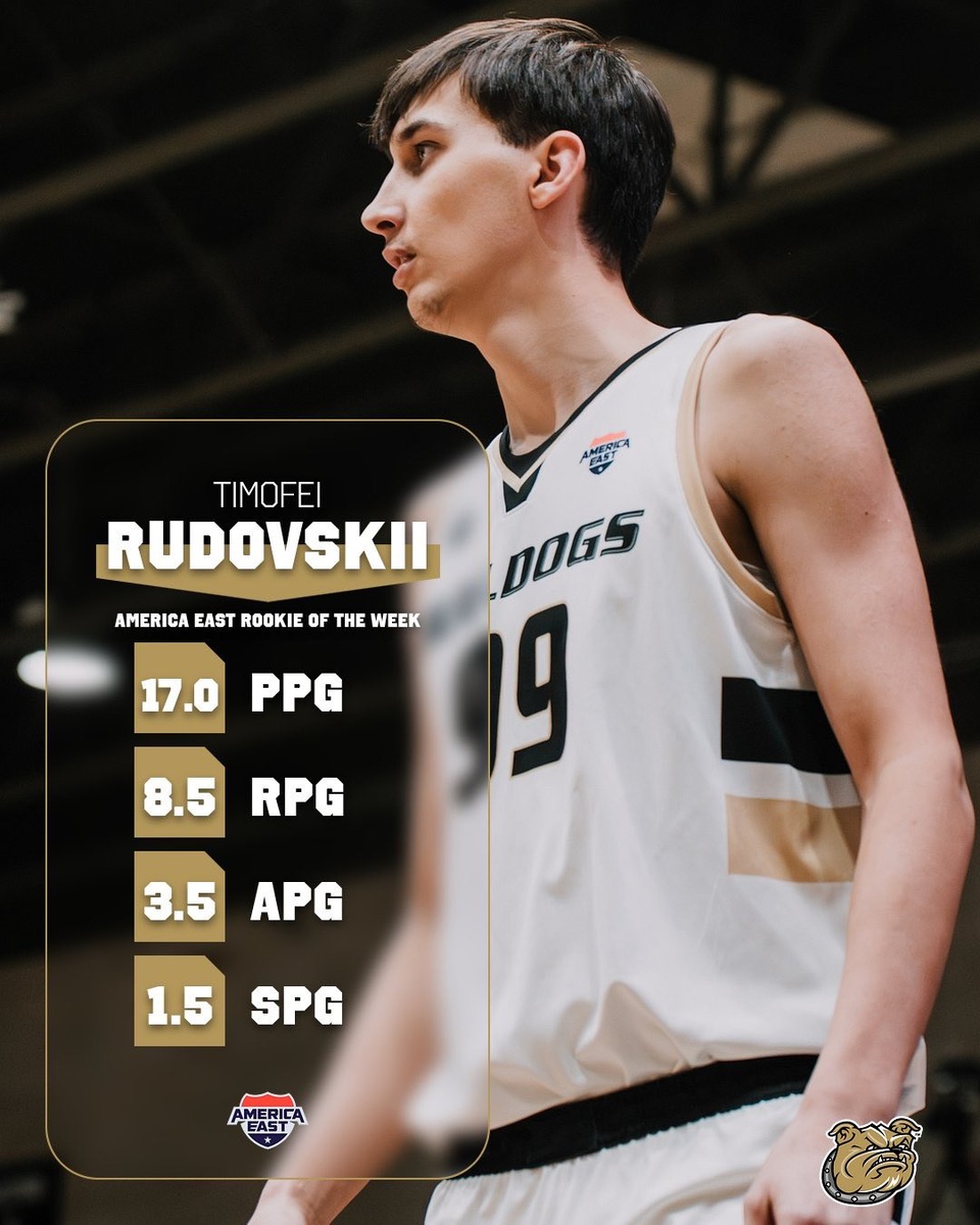 Российский форвард Тимофей Рудовский был признан новичком недели в конференции America East. Это первая подобная награда для Тима. На прошлой неделе Bryant Bulldogs провели два матча, в которых Рудовский в среднем приносил команде по 17 очков, 8,5 подбора, 3,5 передачи и 1,5 перехвата. В частности, в игре против Университета Айоны россиянин сделал свой первый дабл-дабл в NCAA-карьере. Ложка дегтя: «бульдоги» проиграли оба матча. Однако на личной статистике Тимофея это не сказывается — он лучший в команде по очкам (12,5), подборам (5,1) и в тройке по остальным показателям: передачи, перехваты и блокшоты. Он же — лидер своего университета по игровому времени. Поздравляем Тимофея Рудовского и желаем продолжать в том же духе! Подписывайтесь на телеграм-канал «Перехват» — ваш главный источник новостей о российском баскетболе: http://t.me/thesteal