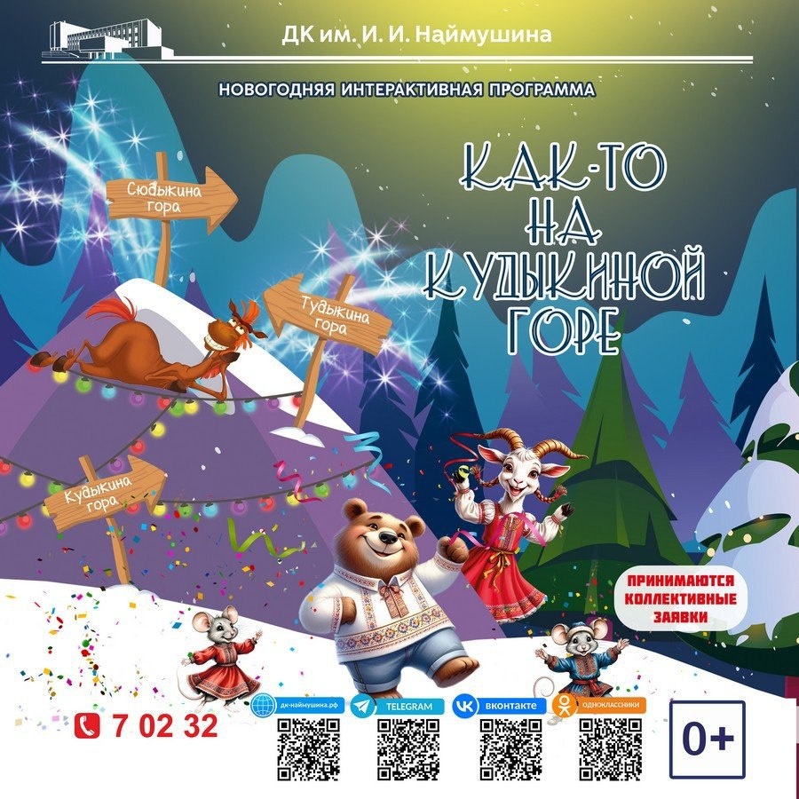 Не секрет, что в канун Нового года каждый ребёнок ожидает чуда. Но где же его увидеть? Где найти такой волшебный уголок? Дворец культуры имени И. И. Наймушина предоставляет уникальную возможность отправиться в новогоднее путешествие в Тридевятое царство. Сказочные обитатели приглашают самых маленьких на праздничный переполох у подножия Кудыкиной горы. Подарите своему ребенку настоящее новогоднее чудо! 27 декабря, 11:00 Принимаются коллективные заявки Билеты в кассе ДК и на сайте https://center-kino.ru/221/release/10066234 Справки по тел.: 8 (39535) 7-02-32 0+
