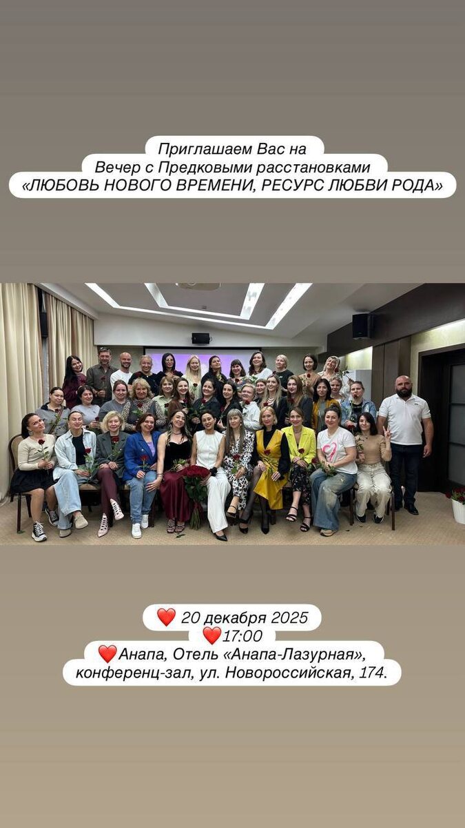 Любимые ❤️ Приглашаем Вас на Вечер с Предковыми расстановками «ЛЮБОВЬ НОВОГО ВРЕМЕНИ, РЕСУРС ЛЮБВИ РОДА» ДЛЯ ТЕХ, КТО: 🌟Чувствует, что живет «не свою» судьбу, а повторяет сложные сценарии. 🌟Сталкивается с одними и теми же трудностями в отношениях. 🌟Чувствует нехватку сил, «надлом» вНутри. 🌟Хочет исцелить родовые травмы и получить доступ к источнику жизненной силы предков. 🌟Готов исследовать связи нового времени: кармические, близнецовые, родственные партнерства. КАЖДЫЙ ИЗ НАС — НЕ ТОЛЬКО ЛИЧНОСТЬ, НО И ЖИВАЯ ИСТОРИЯ СВОЕГО РОДА. Наши предки, сильные и сломленные, продолжают жить в нас — через генетический код, эпигенетическую память, через наши неосознанные выборы и повторяющиеся ситуации. Порой мы проживаем не свою жизнь, а незавершенную историю предка, находясь с ним в невидимом «переплетении». Это может проявляться как: ❤️Ощущение «отрезанности» от силы своего рода (мужской или женской). ❤️Страх проявлять свою женственность или мужественность из-за родовой памяти страданий.