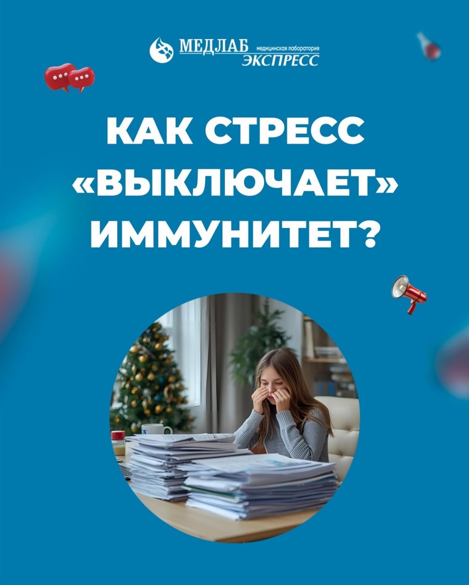 До конца года осталось чуть больше двух недель - и это особенный марафон. ❗️Постоянный стресс — это не только про усталость. Это про иммунитет, который начинает работать хуже именно тогда, когда вокруг максимум вирусов и простуд. Когда вы живёте «на нервах» и в постоянной спешке, в крови повышается уровень стрессовых гормонов — в первую очередь, кортизола. Кортизол подавляет активность иммунных клеток, мешает организму вовремя реагировать на вирусы и бактерии. Как итог: - легко «подхватывается» любая инфекция; - ОРВИ затягиваются; - обостряются хронические болезни. В таких ситуациях врач может рекомендовать: - общий анализ крови; - С‑реактивный белок; - основные биохимические показатели; - при необходимости — исследования для оценки иммунной и гормональной систем. Как помочь организму? ✅Спать хотя бы 6–7 часов в сутки. ✅Не пропускать приёмы пищи, добавлять в рацион белок, овощи, воду. ✅В течение дня: 5–10 минут тишины, дыхательные практики, короткая прогулка. А как проходит ваш