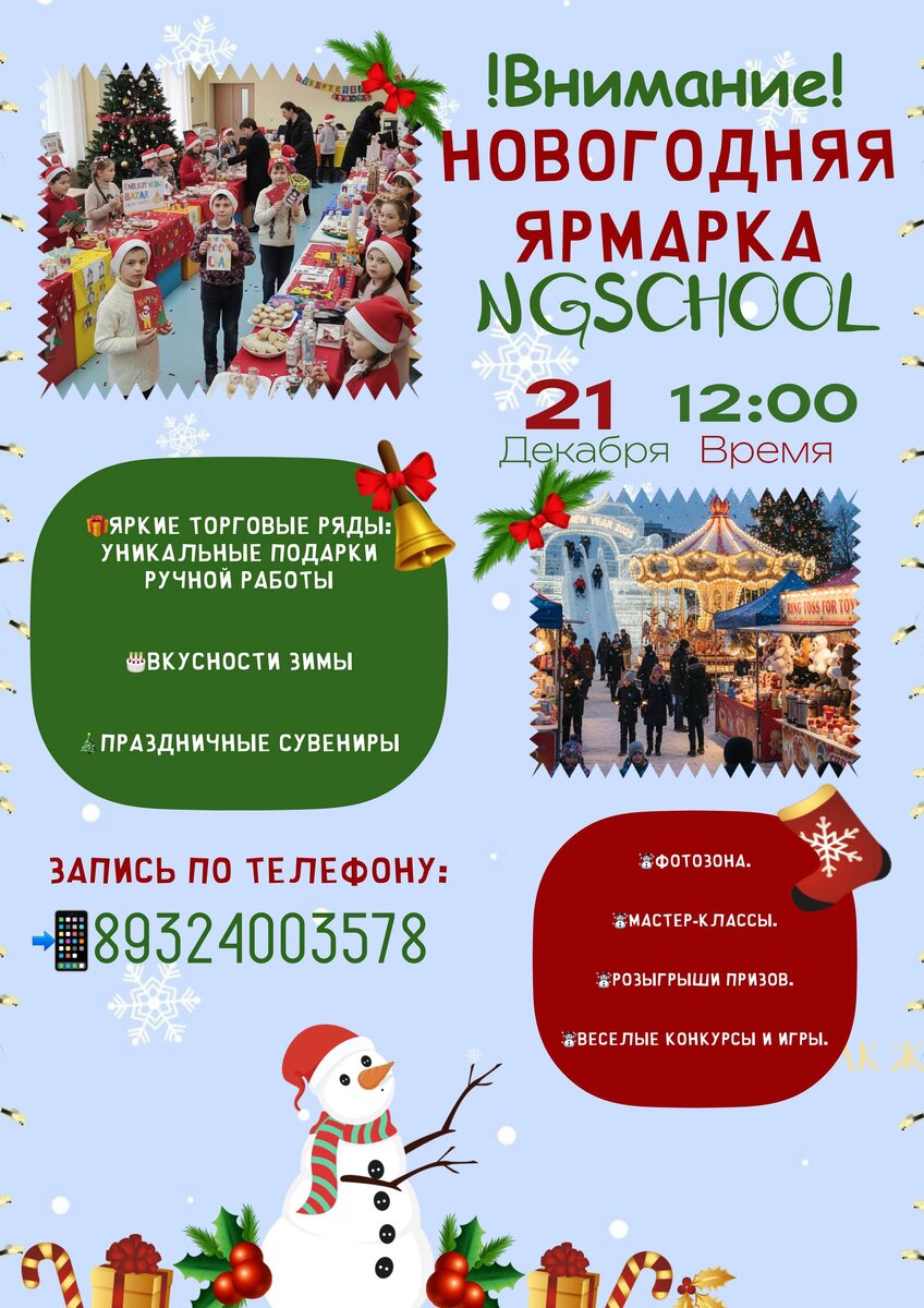 ❄️ВОЛШЕБНАЯ ЗИМНЯЯ ЯРМАРКА в NGschool❄️ 📍ТЦ «МАНДАРИН», 4 этаж Готовы окунуться в атмосферу настоящего зимнего праздника? Мы приглашаем вас и ваших близких на нашу незабываемую ❄️Зимнюю Ярмарку❄️ Date (Дата)📅 21.12.2025 (воскресенье) Time (Время)⏰ в 12:00 Что вас ждет на нашей Зимней Ярмарке: 🎁Яркие Торговые Ряды: Уникальные подарки ручной работы: От теплых вязаных шапок и варежек до авторских украшений и новогодних игрушек – найдите идеальный подарок для себя и своих близких. 🎂Вкусности зимы: Ароматный глинтвейн, горячий шоколад, имбирные пряники, домашняя выпечка и множество других лакомств, которые согреют вас в этот день. 🎄Праздничные сувениры: Елочные игрушки, гирлянды, свечи и все, что создаст волшебную атмосферу у вас дома. Развлечения для Всех: ☃️Розыгрыши и подарки 🎁 ☃️Веселые конкурсы и игры. ☃️Мастер-классы. ☃️Фотозона. Вход свободный! Не упустите свою минуту славы! Запишись прямо сейчас, чтобы стать участником: 📞89324003578 (Ватсап/телеграмм) 📞834662