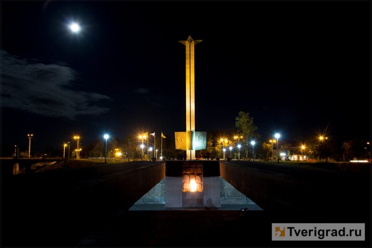 Память о Великой Отечественной… Более 250 тысяч жителей Тверской области погибло в годы Великой Отечественной войны. В их память на стрелке, там, где в Волгу впадает Тьмака, стоит обелиск Победы. Он был открыт 16 декабря 1970 года в честь 28-й годовщины освобождения Калинина от немецко-фашистских захватчиков. Над архитектурным произведением работали скульпторы Иулиан Рукавишников, Анна Филиппова, архитекторы Николай Миловидов, Григорий Саевич, инженеры Борис Кадик, Михаил Шумилов. Обелиск высотой 45 метров венчает факельная чаща, в которой в честь знаменательных дат зажигают огонь Славы. На четырёхметровой высоте закреплены ростры, на которых изложен рассказ о сражениях на фронтах Великой Отечественной войны, о борьбе партизанских отрядов, о том, как трудились в тылу. Автором стихов на этих рострах является поэт Александр Гевелинг, родившийся в Твери. В 1944 году в возрасте 16 лет он отправился вместе с эвакуационным госпиталем в полосу наступления Красной армии на Белорусский фронт. П