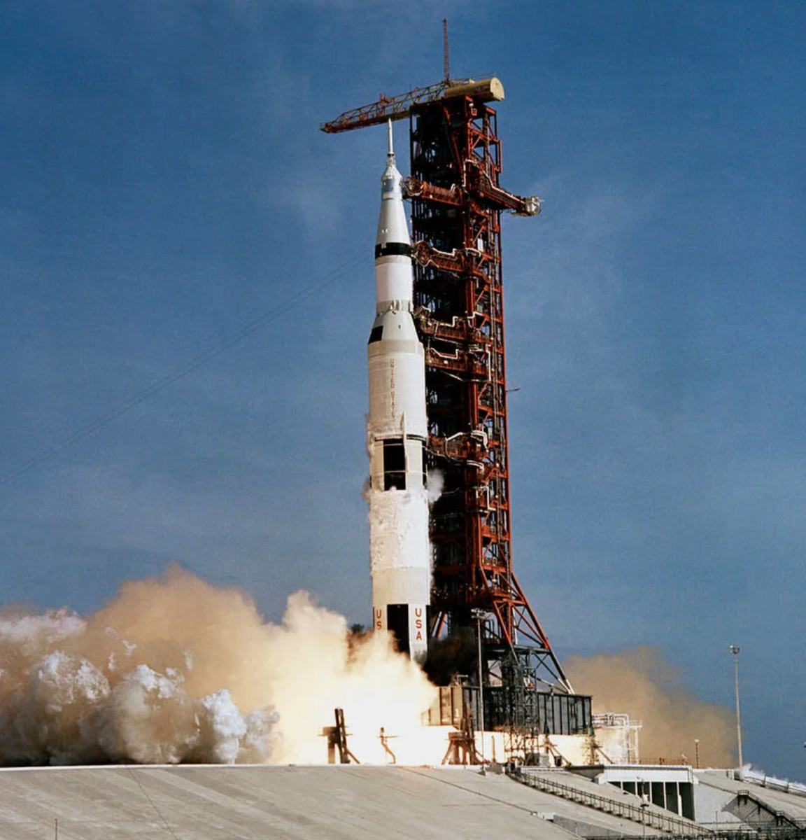 Мощный взлет в 9:32 утра по восточному летнему времени сопровождался мощной вибрацией, сотрясшей землю, и резкими ударными волнами, ощущаемыми примерно миллионом зрителей, собравшихся под палящим солнцем Флориды, чтобы увидеть начало самого дерзкого космического путешествия в истории освоения космоса.