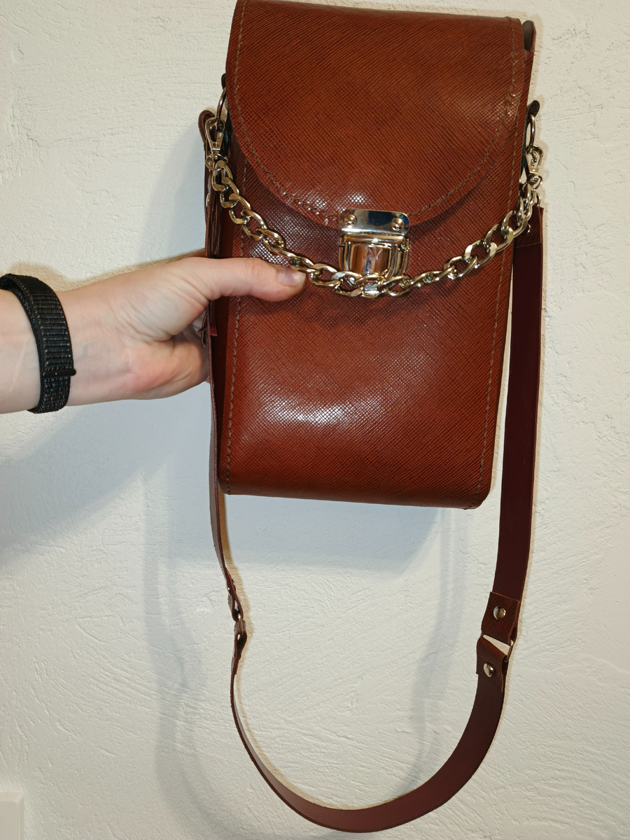 Теперь это уже не заготовка, а моя первая настоящая кожаная сумочка, официально переведённая в разряд «можно носить и гордиться». И у неё есть имя — Jingle Bag. Оказалось, ято при ходьбе цепочка на клапане мягко позвякивает, перекликаясь со звуком ключей, подвешенных внутри на кейпорте, и сумка буквально живёт своим маленьким городским звонким ритмом.