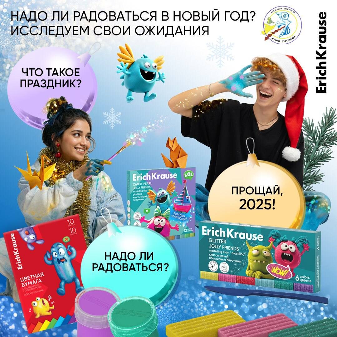 По пути к новогоднему настроению совместно с ErichKrause! 🎄Мы уже сделали первый шаг на пути к новогоднему настроению, пора делать следующий! Тема второй совместной арт-терапевтической встречи: «Надо ли радоваться в Новый год?Исследуем свои ожидания» 🎄 «Праздник - это испытание для личности» — считает выдающийся отечественный мыслитель Александр Асмолов. 🎄Не становится ли Новый год трудным испытанием: хочешь не хочешь, а радуйся? Арт-терапия поможет узнать, так ли это? И если да, то как его пройти? Можно ли радость включить по команде? 🎄Когда используешь для работы материалы для творчества ErichKrause настроение сразу улучшается! Мы уже проверили в деле акриловые краски, карандаши, фломастеры и многое другое! На очереди пластичные материалы!