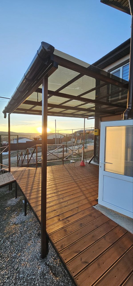 Привет! На прошлой неделе мы закончили монтаж этого навеса и теперь могу за него немного рассказать. Итак. Это очередная работа для постоянного клиента. Сначала мы сделали туда большое количество пандусов и площадку, потом немного ограждений и вот решили сделать навес. Площадь по полу - 3870*3740 Уклон по короткой стороне. Несущие балки - 80*40*3 Обрешётка - 50*30*3 Столбы - 60*60*3 Накрыли монолитным поликарбонатом цвет бронза Водосточная система - Технониколь. Монтаж и покраска произаодились по месту по ряду причин. Самая первая - это экономия. Монтаж по месту оказался на 12% выгоднее чем изготовление крупных узлов в мастерской и потом их установка на месте при помощи спецтехники. За крепёж. Весь навес стоит на своих собственных ногах к дому и террасе крепится при помощи 4х конструкционных саморезов, чисто чтоб убрать взаимный люфт. Полик прикручен к конструкции через демпферную резину и с предварительным засверливанием поликарбоната большим диаметром. Столбы рядом с домом