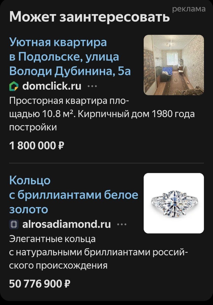 Контекстная реклама, ты в уме ли? Заманчиво: купить просторную одиннадцатиметровую квартиру в Подольске за 1,8 млн, а на сдачу прикупить колечко с пятикартаным бриллиантом. Или в другом порядке надо?