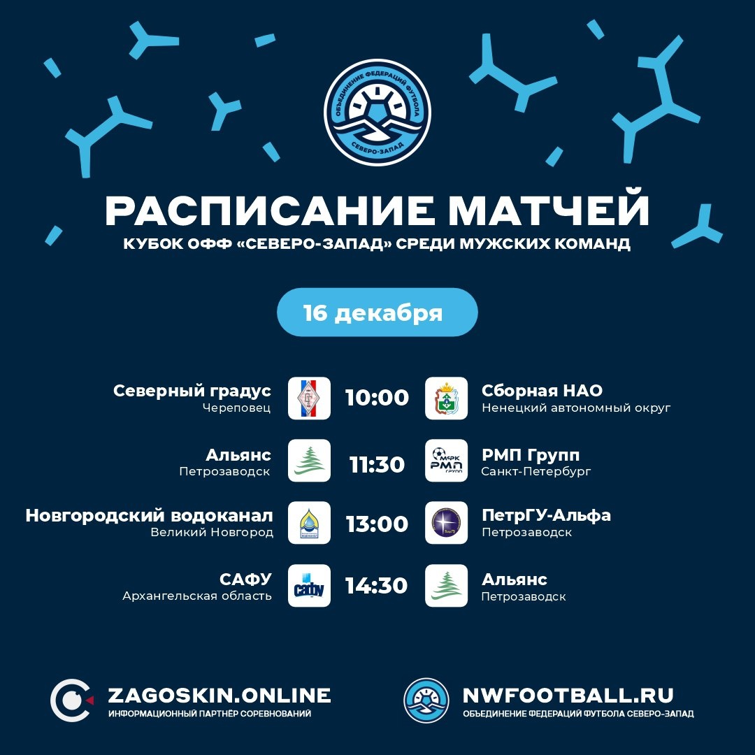 🏆 В Великом Новгороде второй день Кубка ОФФ «Северо-Запад» среди мужских команд 10:00 «Северный градус» — Сборная НАО 📺 Прямая трансляция 11:30 «Альянс» — «РМП Групп» 📺 Прямая трансляция 13:00 «Новгородский водоканал» — «ПетрГУ-Альфа» 📺 Прямая трансляция 14:30 САФУ — «Альянс» 📺 Прямая трансляция #новости #zagoskin_online #футзал #ОФФ #сезон25_26