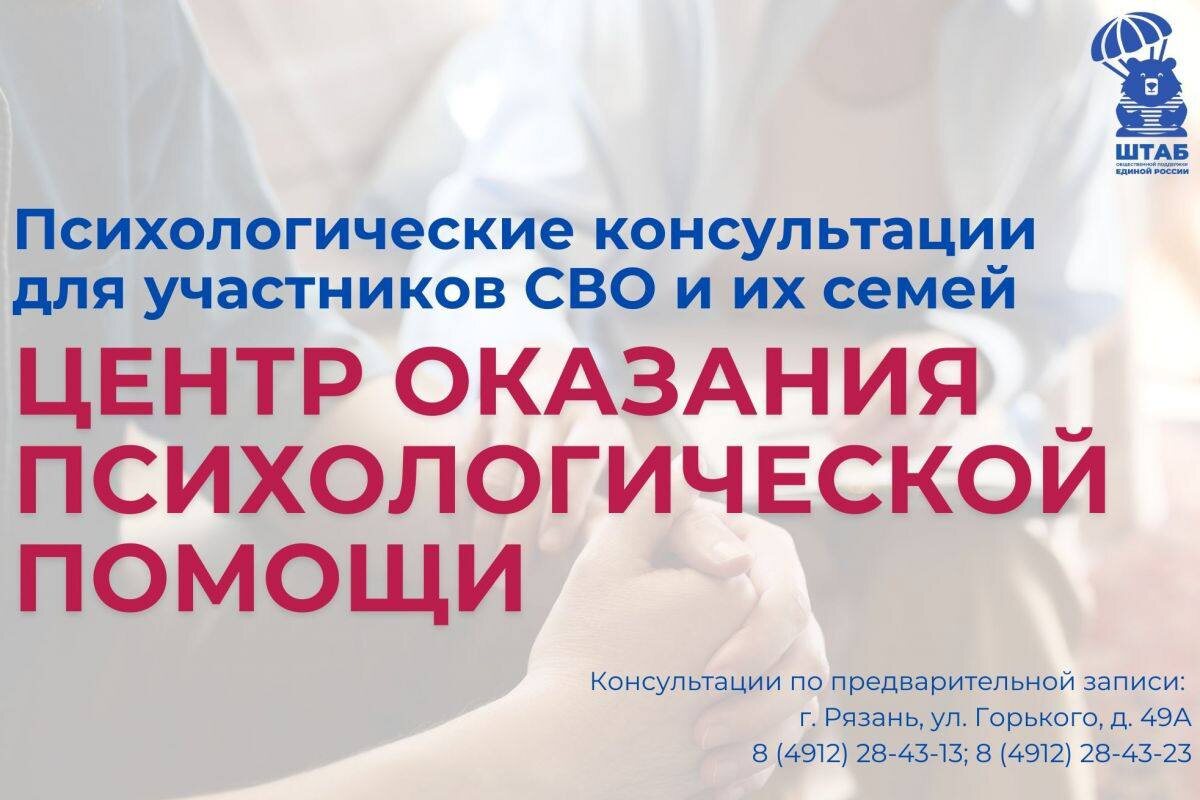 Участники СВО и члены их семей могут получить консультацию в Центре психологической помощи в штабе общественной поддержки «Единой России» Очередная встреча состоится 19 декабря в 14:00. Консультацию проведет кандидат педагогических наук, доцент кафедры психологии и социальной работы РГУ имени С. А. Есенина, а также опытный практикующий психолог Ирина Ладохина. Адрес штаба общественной поддержки «Единой России»: г. Рязань, ул. Горького, д. 49А. Запись и дополнительная информация по телефону: 8 (4912) 28-43-13. #ЕдинаяРоссия #ШтабОбщественнойПоддержки