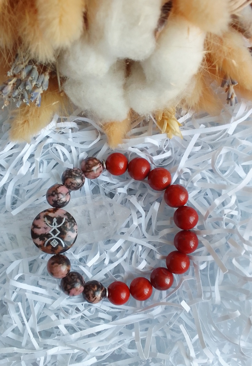 Браслет состоит из натуральных камней родонита, красной яшмы и руны «Зарод».