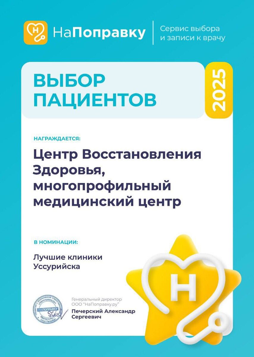 🏆 Ещё одна награда — и снова благодаря вам! Друзья, мы с огромной радостью делимся новостью: наша клиника стала победителем премии «Выбор пациентов 2025» 💛 И особенно приятно, что это уже не первая награда для нас в этом месяце — значит, мы действительно движемся в правильном направлении. Эта премия — выбор пациентов. Ваши отзывы, рекомендации и доверие помогли нам войти в 7% лучших медицинских центров страны. Для всей нашей команды это большая честь и мощная мотивация становиться ещё лучше. Мы искренне благодарим каждого пациента за выбор, доверие и обратную связь 🤍 Спасибо, что помогаете нам делать медицину более внимательной и человечной. С заботой о вашем здоровье, ваша команда Центра Восстановления здоровья💙
