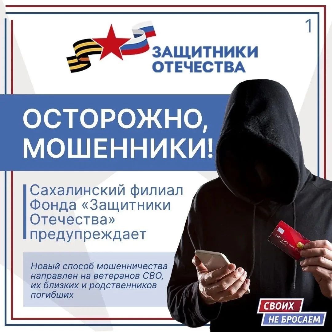 Внимание! Будьте бдительны! 🔹По всей стране вновь активизировались мошенники. Они звонят в семьи участников СВО и выманивают персональные данные, представляясь сотрудниками госорганов, минобороны или социальными координаторами фонда «Защитники Отечества». 🔹Тема для разговора всегда актуальная - пенсии, выплаты за ранения, получения наград и прочего. Запомните, подобные разговоры необходимо всегда обрывать, как только вас просят назвать персональные данные. 🔹Если вы не уверены, что говорите с известным вам оппонентом, то переспросите откуда звонят, положите трубку и свяжитесь с вашим социальным координатором в фонде «Защитники Отечества», расскажите о случившемся. 🔹Не верьте, если вам кто-то рассказывает про плен, пропажу, ранения или иную чувствительную тему. Только по горячей линии войсковой части или через фонд вы можете запросить достоверную информацию о вашем родственнике. ☎️ Телефон сахалинского филиала фонда «Защитники Отечества»: 8 (4242) 55-74-10.
