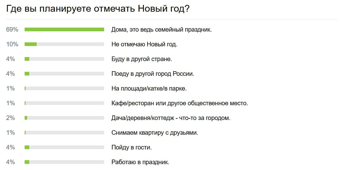 Мы решили поинтересоваться у хабаровчан, где они планируют отмечать Новый год. 69% сообщили, что будут делать это дома со своими близкими, ведь праздник — семейный. 10% в принципе не планируют каких-либо мероприятий. 4% будут в другой стране, 4% поедут в разные города России, 4% пойдут в гости и еще 4% в праздники будут работать. 2% собираются отмечать на даче, в деревне или в коттедже. 1% собирается отмечать на площади или в парке, еще 1% — в кафе или ресторане. И последний 1% планирует снять квартиру с друзьями. Отметим, что на главной странице DVHAB.ru каждую неделю проводятся опросы на самые актуальные и острые темы. Найти их вы можете, пройдя по ссылке. Напомним, ранее мы интересовались у хабаровчан, сколько они планируют потратить на подарки на Новый год. 24% ответили, что на эти цели уйдет более 10 тысяч рублей. 23% потратят от 5 до 10 тысяч рублей, 18% отложили на эти цели от 1 до 5 тысяч рублей, 17% никому ничего дарить не собираются, 11% еще не думали о предполагаемых подарка