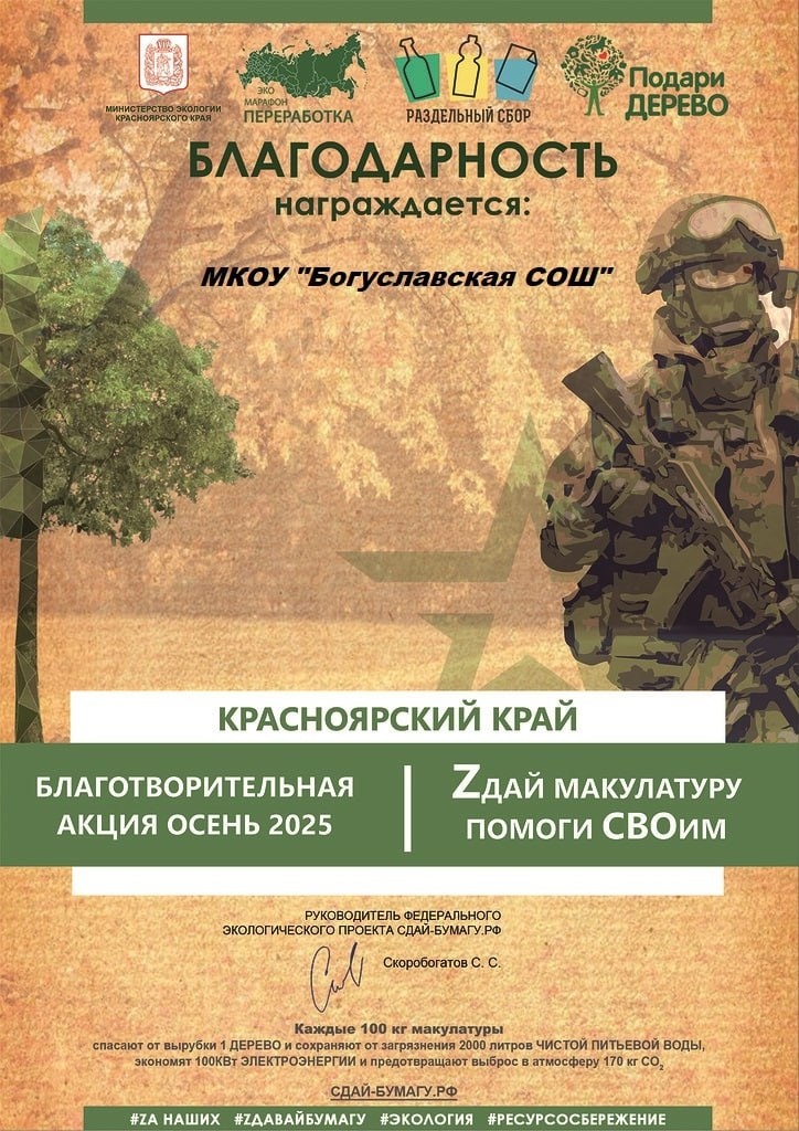 Осенью 2025 года Богуславская школа приняла участие во Всероссийском эко-марафоне «ПЕРЕРАБОТКА», который прошел под девизом «Zдай бумагу