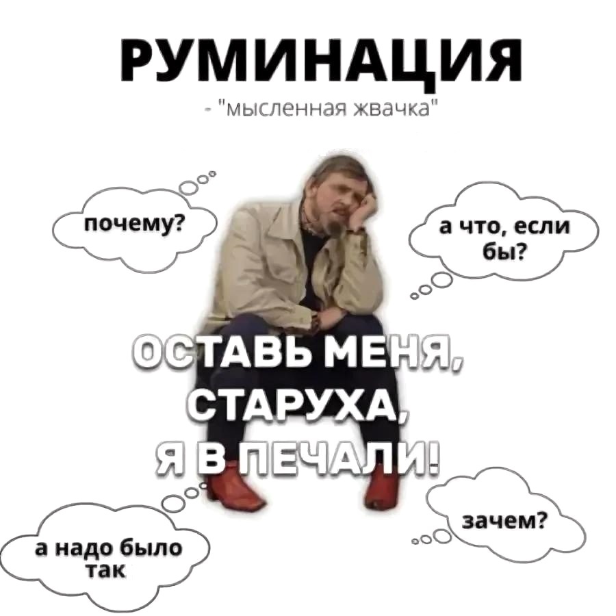 📌 Новая тема для погружения на ближайшие дни «ТОКСИЧНАЯ ПРИВЫЧКА НАШЕГО МОЗГА - МЫСЛЕННАЯ ЖВАЧКА vs РУМИНАЦИЯ» 🤔 А вы знали, что наш мозг создает зависимости. И это не только от кофе. Одна из самых токсичных - это МЫСЛЕННАЯ ЖВАЧКА (научное название в психологии – РУМИНАЦИЯ). РУМИНАЦИЯ / МЫСЛЕННАЯ ЖВАЧКА (или «умственная жвачка») – это навязчивый, непроизвольный и циклический процесс бесцельного обдумывания одних и тех же мыслей, проблем или переживаний, который не приводит к решению, а лишь усугубляет эмоциональный дискомфорт. 💢Ключевые характеристики: 👉🏻1. Непродуктивность и цикличность: мысли ходят по кругу, возвращаясь к одним и тем же вопросам («Почему это случилось со мной?», «Что, если бы я поступил иначе?», «Что они подумали?»). Человек не ищет выхода, а лишь «пережёвывает» проблему. 👉🏻2. Сфокусированность на прошлом или будущем: анализируются уже случившиеся неприятные события или катастрофизируются возможные будущие. 👉🏻3. Усиление негативных эмоций: вместо того чтобы