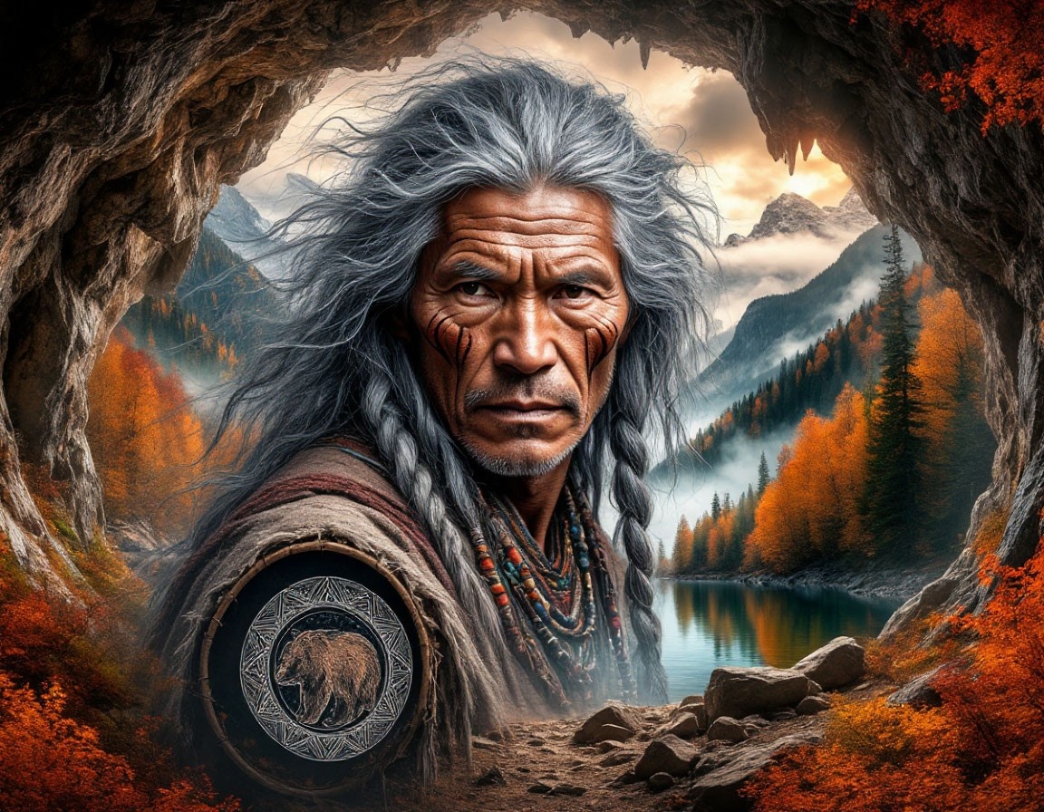 Мы стояли у входа в пещеру. Вокруг царила бархатная и звездная ночь. Тёмная и чёрная. Едва светилась во мраке вода, плещущая в плотных берегах. Река сейчас казалось живой и необычно тяжелой. Щербатый вход в пещеру улыбался, как знакомой. Я ощущала всем телом прикосновение живого и чуткого пространства. Фёдор снял свой плащ и накинул мне его на плечи. Жёсткая тяжёлая кожа, дублёная и плотная соприкоснулась с мягкостью моей. И я впервые увидела Фёдора такого, какой он есть. Гибкая фигура, сухощавая и лёгкая. Мягкие сапожки из оленьей кожи, тонкой выделки кафтан из лосиной ровдуги мехом внутрь, яркие бисерные украшения, широким треугольником спускающиеся по груди чуть не до самых колен. Меховые длинные вставки на плечах и широкие полосы меха сзади почти до земли. Его изрезанное морщинами лицо смягчилось, и на секунду мне показалось, что резкие проницательные глаза помолодели и заблестели. И правда, шаман расхохотался. Отрывистый смех перешёл в беззвучный и широкий, охватывая пространство низкой звуковой вибрацией. Я невольно улыбнулась тоже, в попытках разгадать, что значит этот беззвучный смех. Фёдор, отсмеявшись, подошёл ко мне вплотную, прикоснулся к моей груди, потом плавно провел по руке, и снова беззвучно рассмеялся. Я вопрошающе уставилась на него.